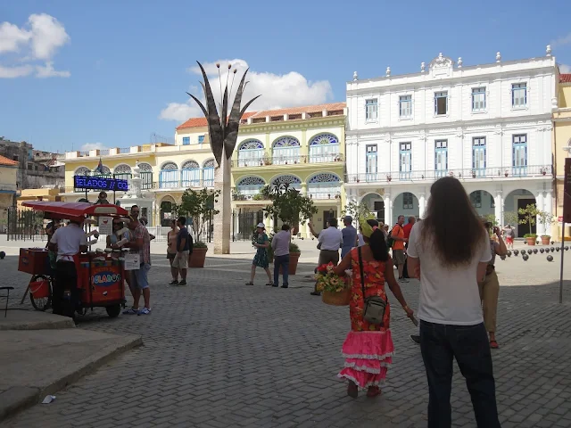Mujeres cubanas merodean la Plaza vieja solicitando dinero a cambio de una fotografía, llevan vestidos estampados de flores tropicales o colores lisos con mucho vuelo, lo que representa el sol, las playas y el ritmo de la isla, ademas en la cabeza cintillos con flores naturales